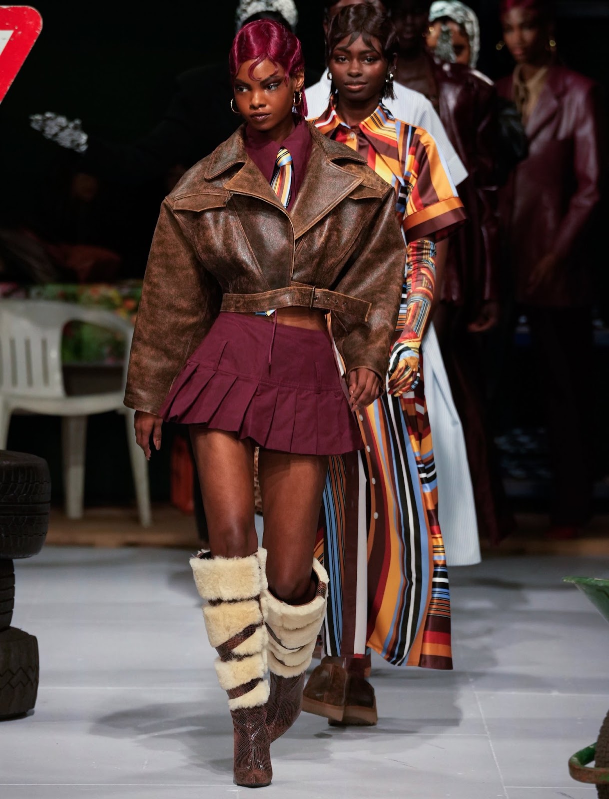 Tolu Coker broke High fashion Twitter when her AW24 collection photos from London Fashion Week hit the internet. The Nigerian designer reclaimed leather tailoring by upcycling it and introduced a new type of UGG shoes- the UGG boots. The knee-high reconstructed UGGs were an instant hit but the collection itself was jaw-dropping. Tolu Coker has been making waves for her sustainable designs and her latest line which she called “Broken English” a reference to the slang for a non-standard version of English, sometimes referred to as pidgin. As the collection featured typical British silhouettes, however, it did this in an upcycled manner… a non-standard manner. She incorporated Nigerian accessories such as cowries and shekere; she was equally inspired by Ghanaian street style.