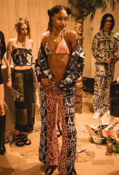 ABIGAIL AJOBI decided to take on London with its ANTI-MUSE 2 collection. The ANTI-MUSE collection made its debut last year at the Heineken Lagos Fashion Week. However, there were several new designs added to the collection for its London Fashion Week showcase, hence, this is the 2.0. The collection included t-shirts that were sold exclusively on-site, the front of the t-shirts had photographs by Abigail Ajobi at its centre. The collection reintroduced its tie and dye pieces, along with its partially dyed denim pieces from the first ANTI-MUSE collection. The Nigerian designer wanted the set of the fashion show to have a Lagos vibe so the space was decorated with sand and faux palm trees.